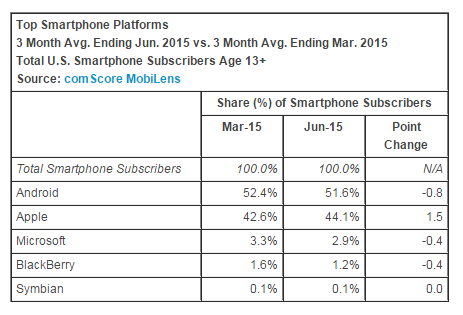 Menurut laporan comScore untuk bulan Juni 2015, semua saingan Apple mengalami kemerosotan tajam ketika ingin mempertahankan pangsa pasar ponsel pintar. Sedangkan pemakaian perangkat mobile yang dijalankan dengan iOS semakin dahsyat di Amerika.