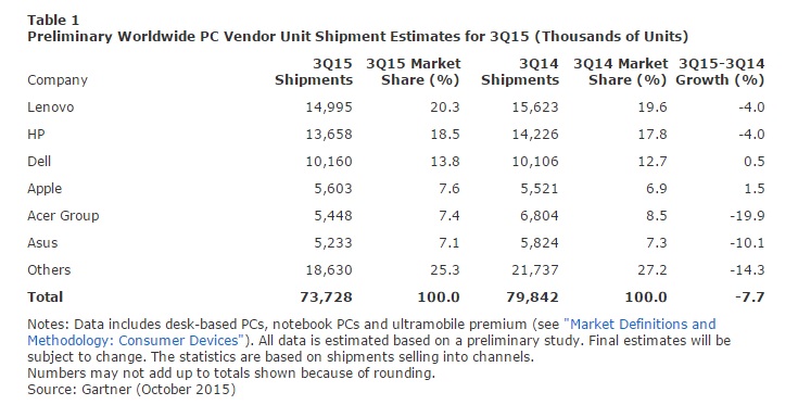 Menurut Gartner, hanya Dell dan Apple yang mengalami peningkatan dalam pengiriman PC pada kuartal ke-tiga (Q3-15). Sedangkan Lenovo dan HP masing-masing turun 4 persen. Acer dan Asus menelan pil pahit dan mengalami penurunan diatas 10 persen.