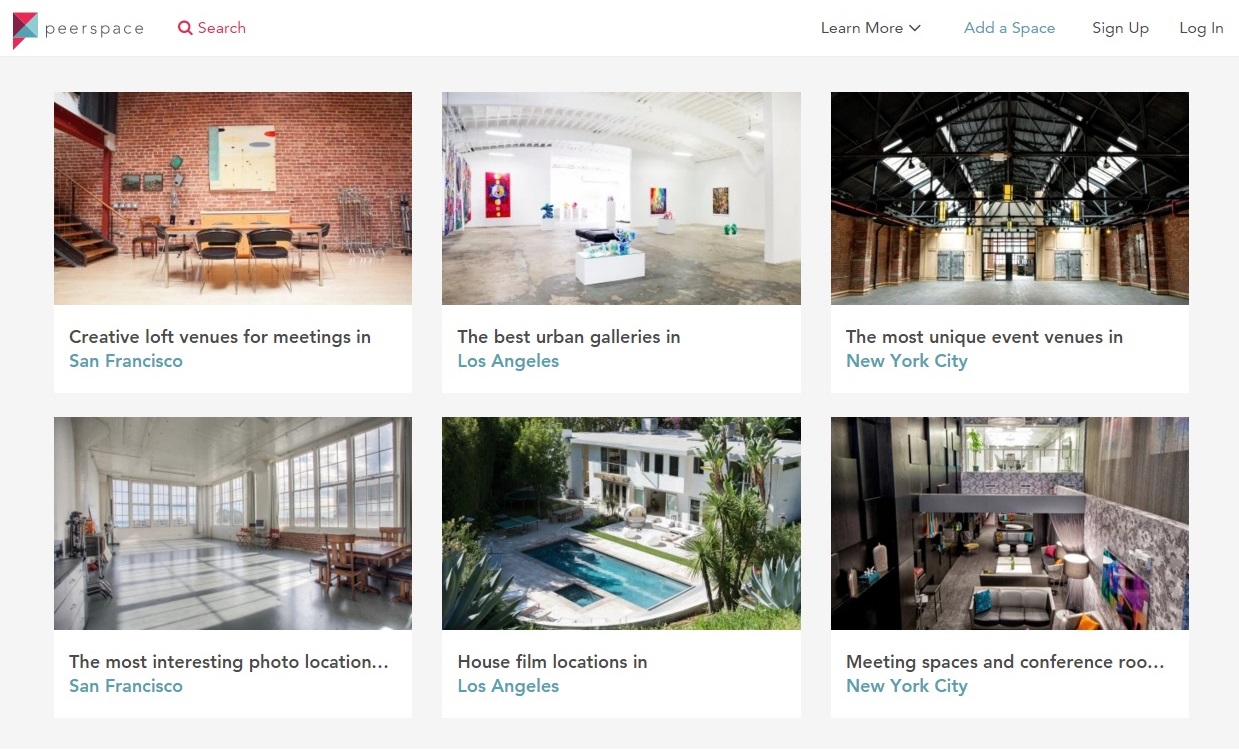Untuk mendukung kelancaran acara pertemuan di kota-kota besar, maka PeerSpace membangun inovasi pasar penyewaan ruang pertemuan yang unik dan bersifat jangka pendek. Startup ini menyediakan daftar gedung, ruang, studio, gudang, atau rumah yang kosong, yang dapat di pesan untuk ruang pertemuan, acara rapat, tempat pembuatan film, dan sebagainya.