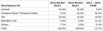 Pangsa pasar ponsel pintar di Amerika untuk bulan November 2012: sistem operasi Google Android menduduki peringkat teratas dengan 53,7 persen pangsa pasar, disusul oleh Apple iOS dengan 35,0 persen pangsa pasar, sedangkan RIM BlackBerry dan Microsoft Windows Phone semakin hilang dari muka bumi